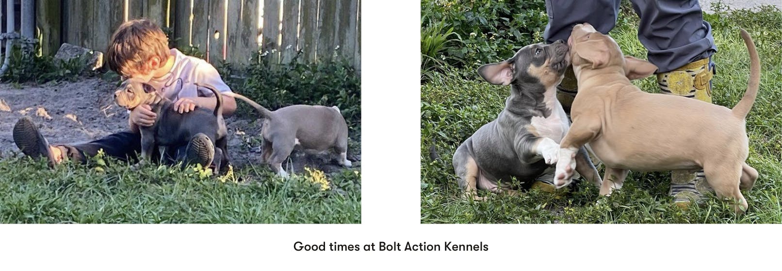 With its robust history of breeding experience, excellent health-testing standards, and long-demonstrated dedication to the bully breed, Bolt Action Kennels was exactly what the city-dwelling couple was looking for. They submitted an application via Good Dog, and the process began. They were soon matched with “Boy 2,” a small, dark pup from Bolt Action parents Charger and Winrey’s litter, and decided to call him Bear. Even though hundreds of miles separated Bear from his soon-to-be parents, they received updates with photos showing his growth, his personality, and his life in Florida. Before his big journey north, Bear had quality time playing with kids, napping with his puppy siblings, and frolicking in the yard. A short eight weeks after he was born, he was ready to get on an airplane and fly to his new home.