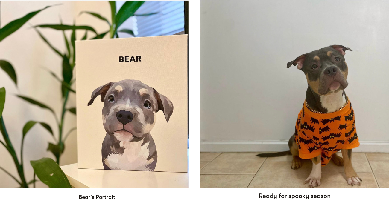 A scroll through @bearinnyc on Instagram shows Bear traipsing around New York in all his sweet bully glory. Whether he’s framed by a background of skyscrapers on a bright summer day, shown frolicking in the snow in the dead of the Northeast winter (and for a Florida pup, no less!), captured decked out in a festive sweater for Halloween, or donning a party hat to celebrate his first birthday, Bear always looks like the happy-go-lucky puppy the Donadelles describe him as. Social media has allowed their New York City community to extend past city limits, and now people from all over the world can live vicariously through Bear’s adventures. He even collaborated with an artist who painted his puppy portrait!