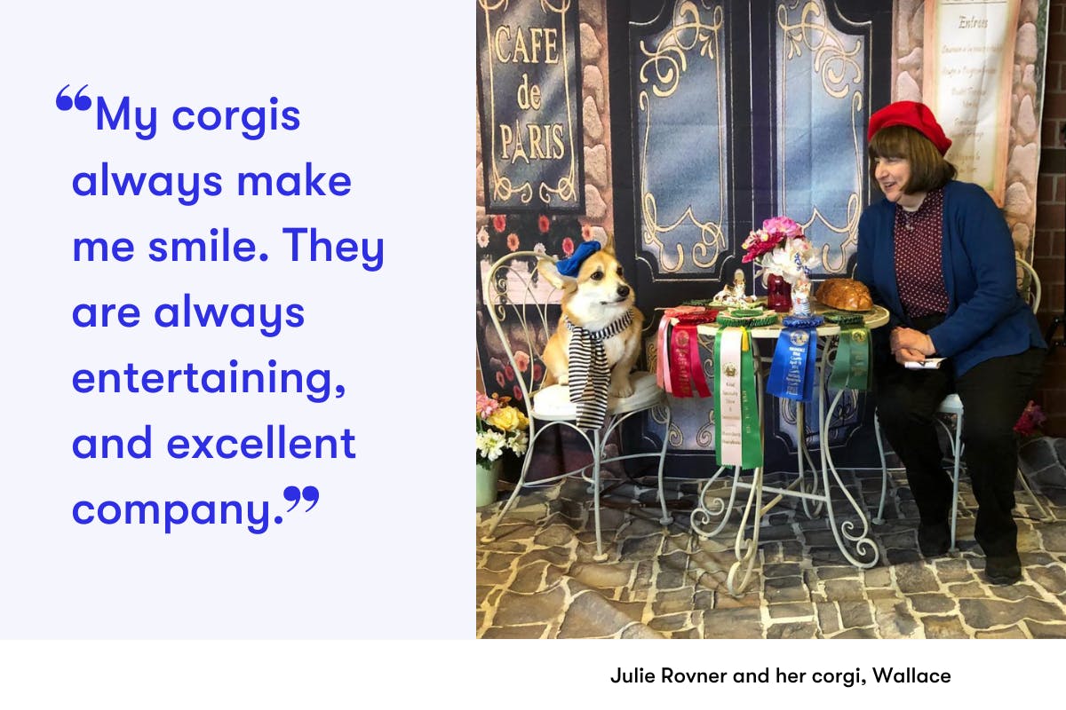 “My corgis always make me smile. They are always entertaining, and excellent company,” Julie Rovner said about her pups. “I love their attitude, and how pleased with themselves they are when they do well. And they can be stubborn. But they are fun to work with.”