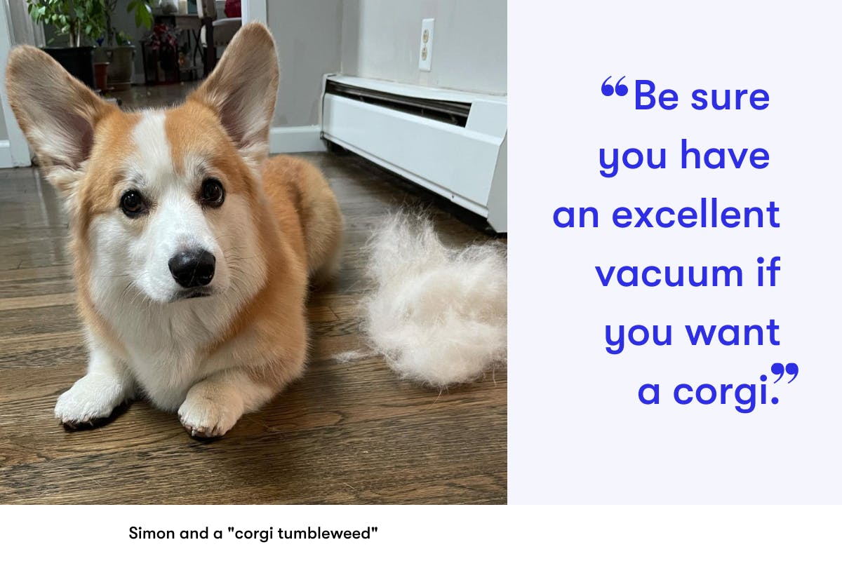 As a lifelong dog owner, Lauren Greco knew what she was getting into before adopting Simon. “Corgis should have long life spans, 12-15 years or longer, which is quite a time commitment for someone who isn’t prepared,” she said. “They also shed like crazy, all year round,” she continued, noting that the time and financial impact of grooming and upkeep can be a surprising hurdle for the unprepared corgi owner. Breeder Eddie Quezada is also no stranger to corgi shedding, lovingly referring to all the discarded hair as “little corgi tumbleweeds.” Julie Rovner, the dog mom to corgis Wallace and Aspen, agreed, suggesting, “Be sure you have an excellent vacuum if you want a corgi.”