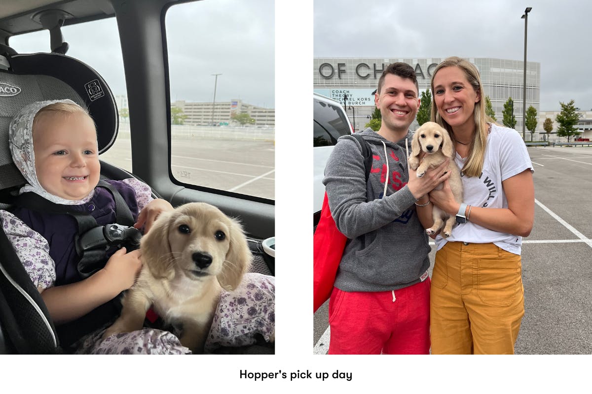 “We planned to travel to Chicago to pick up Hopper,” Lees recalled. “The Bruno family was kind enough to drive from Indiana and meet us there. Pamela made the morning extra special by calling to let me know Hopper was on his way, and she sent photos of him being held and hugged by her sweet grandchildren before getting into his crate. It truly felt like they were just as excited as we were for the big transition home. Meeting up was easy, and Little Paws Doxies made ‘gotcha day’ extra special by sending Hopper home with an embroidered baby blanket, some food and toys. We were totally in shock with how small and precious he was! He slept the whole way home, and we never took our eyes off him.”