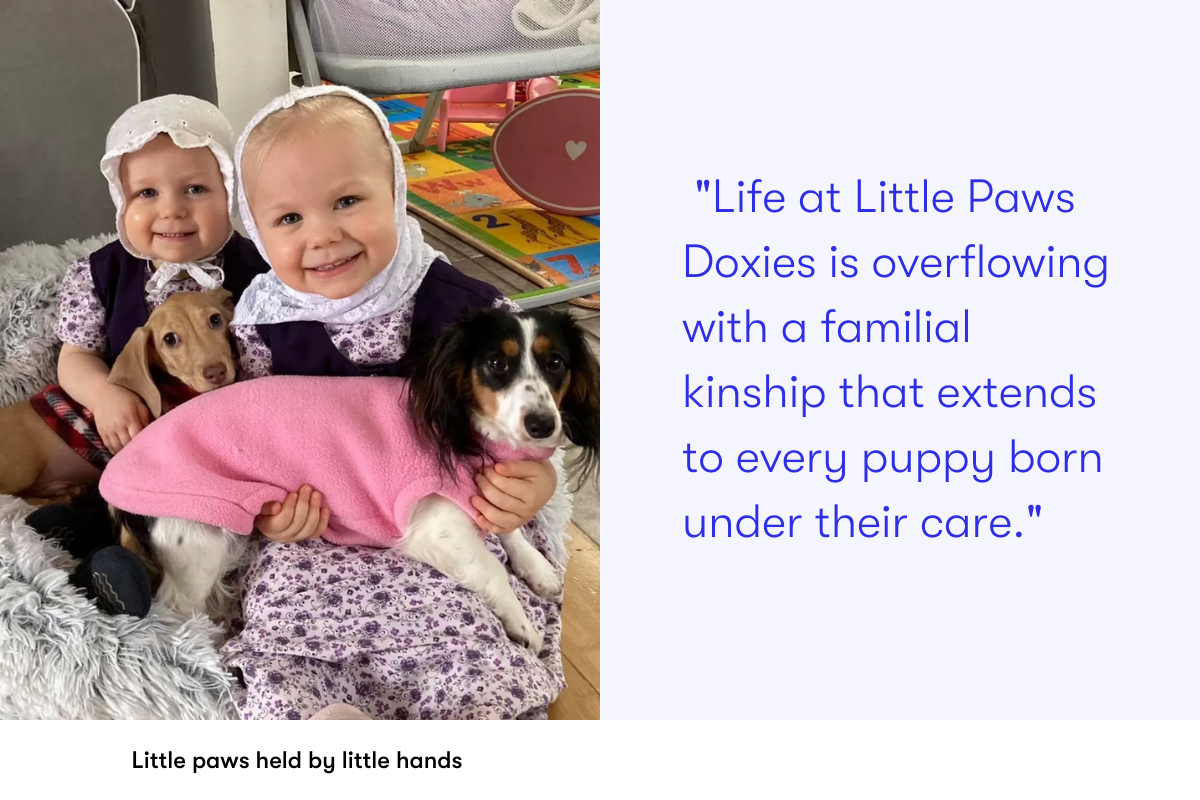 Pamela Bruno fell in love with dachshunds after getting one for her son as a birthday gift. He’d been asking for years, and by fulfilling his wish, she unknowingly opened up a door to her future career and passion. Life at Little Paws Doxies is overflowing with a familial kinship that extends to every puppy born under their care. Bruno’s six adult children and their children all live at home, creating an environment where three generations of dog-lovers are available day in and day out to snuggle and spoil the puppies.
