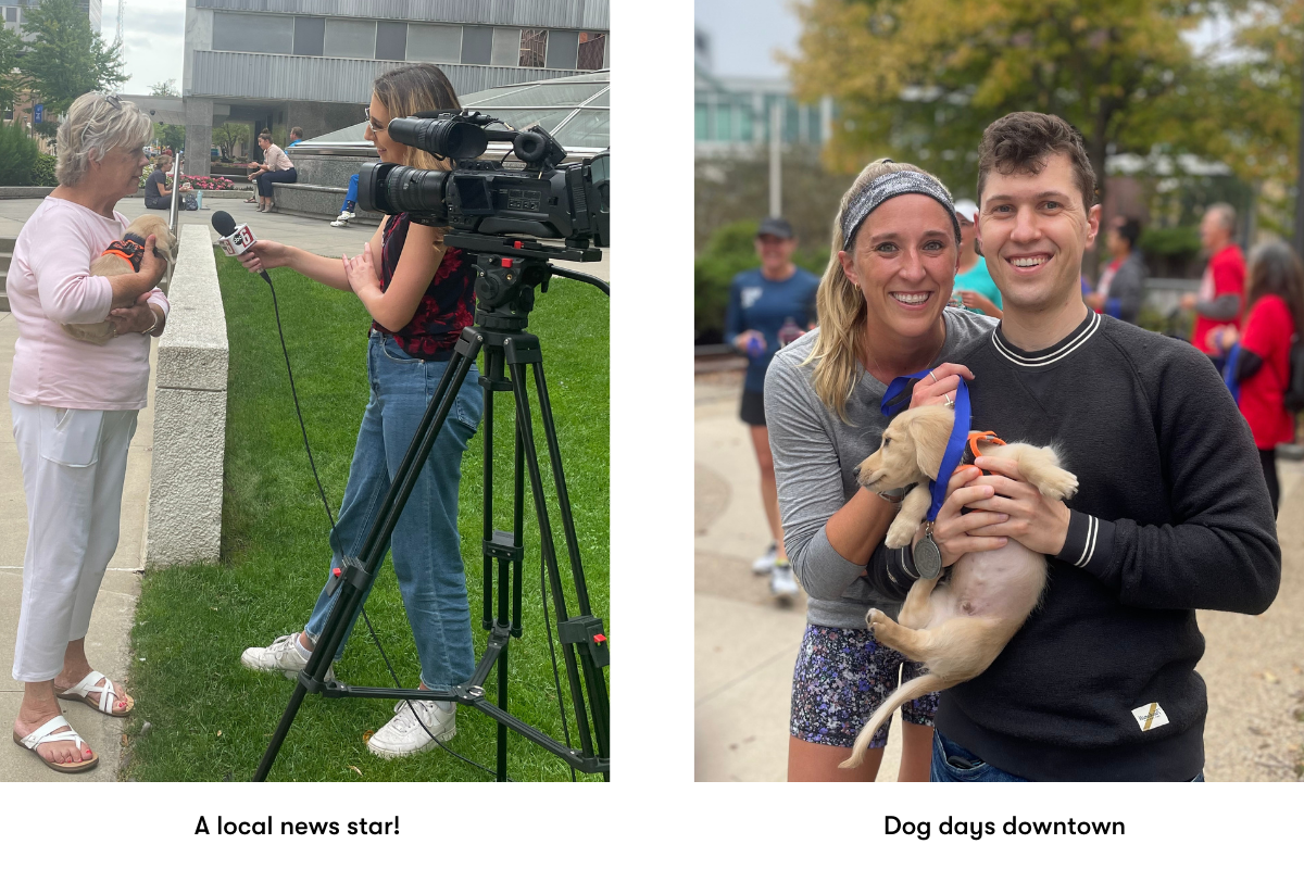 Liz Lees is adamant that Hopper is a people puppy. “We joke that Hopper has more of a social life than either of us. He loves every person he meets,” she said. “Especially kiddos, because he spent a lot of time with children!” All of Hopper’s foundational moments with Pamela Bruno’s adoring grandchildren have carried over into his life in Rochester, and have been a source of delight for his new parents. “My favorite thing is seeing how happy people are to see him,” Lees confessed. “It’s hard not to smile when he is coming your way.”