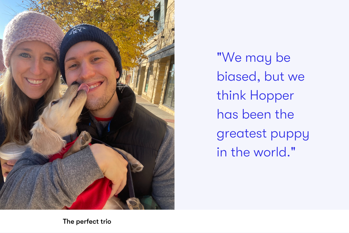 Bringing home a new puppy can be nerve-wracking even for the seasoned pro, so as a novice pet owner, Tyler Kaplan especially appreciated the smooth transition. He “wasn't sure what to expect,” Lees reflected, continuing, “The funniest thing was that he seriously worried whether our dog would like him!” That fear was assuaged mere minutes after Tyler met Hopper for the first time.