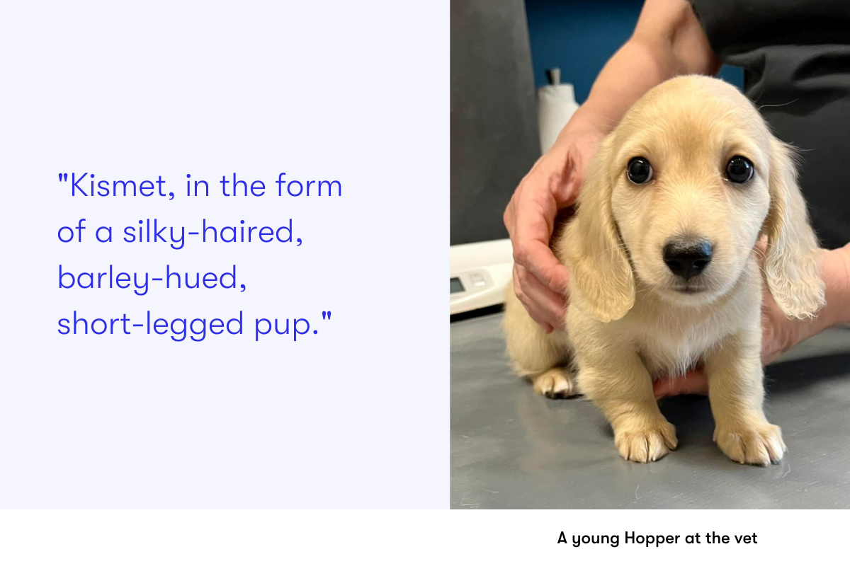“We'll begin calling him ‘Hopper.’ That's cute!” Bruno enthusiastically replied, making a mental note to refer to the sandy-colored dachshund, who was still barely bigger than the palm of her hand, by his new name.