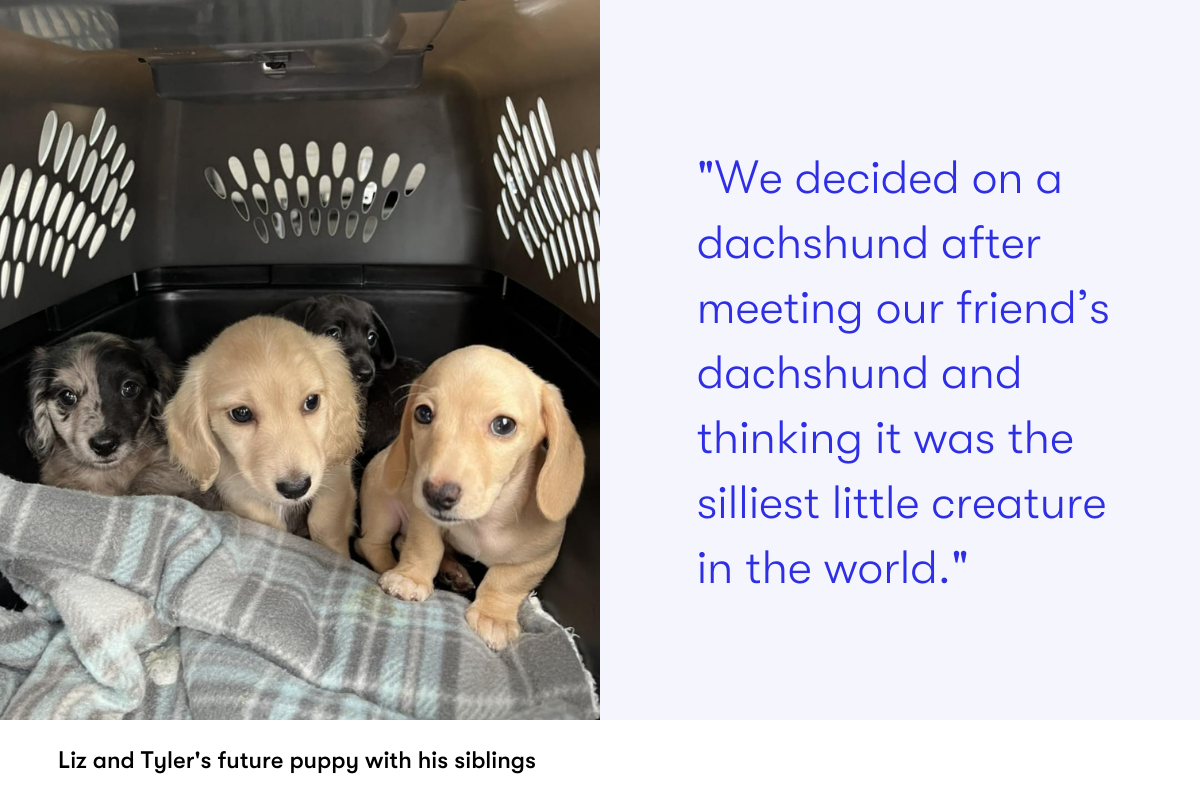 For Liz and Tyler, finding a puppy through Good Dog was a bit of a family affair. Liz Lees’ parents found their Sheepadoodle, Pippa, through Good Dog, so they were familiar with the process and relieved to have a reliable platform on which to look for a puppy. “Good Dog was a great resource for exploring breeders, and we especially liked being able to see reviews from customers,” Liz remarked. “It was helpful to be able to search and communicate directly with the breeders in one place. When it came time to make a deposit, I felt reassured after reading about Good Dog’s security.” With a deposit safely placed, Liz and Tyler had all but secured their puppy from Little Paws Doxies. “Boy #2 from Joanna x Elijah's litter” would soon be theirs.