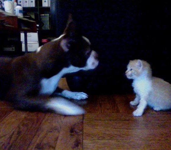 So I went online and read how to introduce a dog into a cat. I set up the bathroom, put newspapers all over — did everything. So then I was like, “All right, we're gonna leave the dog in here. We're gonna introduce them to each other and let him smell each other through the door over the course of a few weeks, five minutes here and there, small interactions,” all that. I was all ready to go.