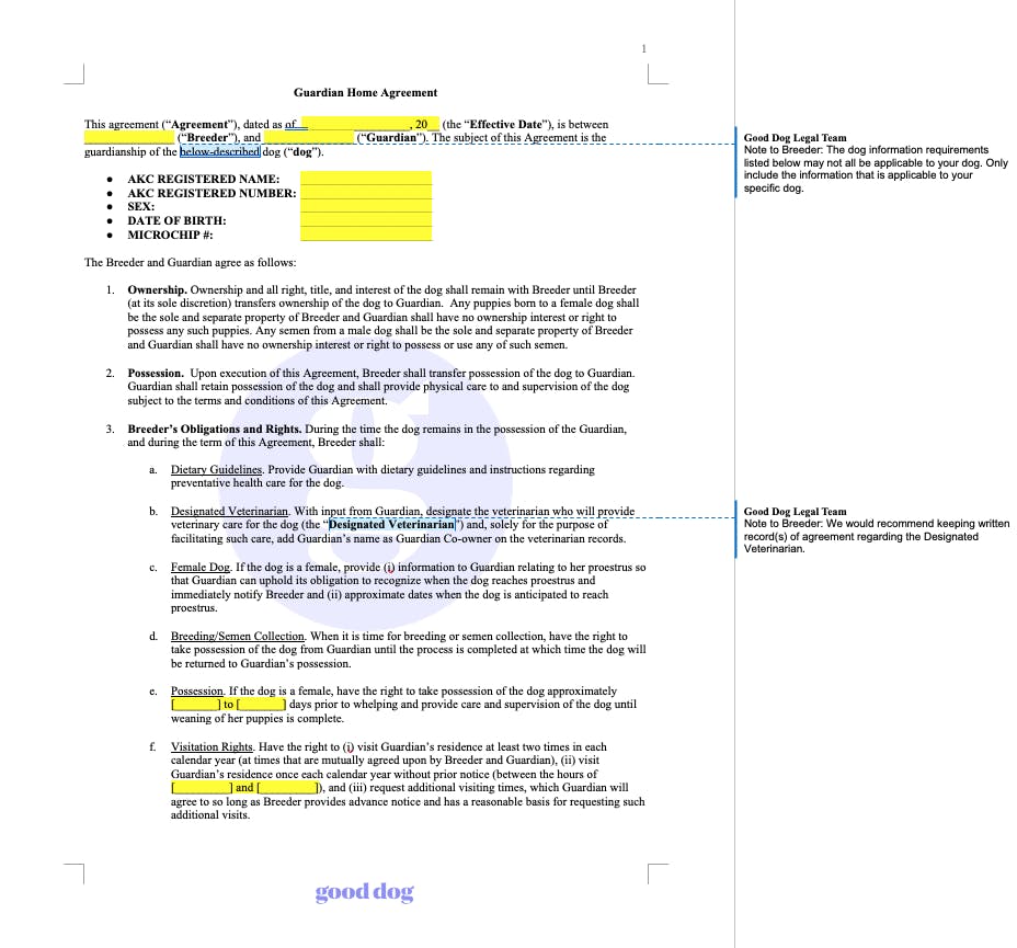 Access our sample Guardian Home contract, available exclusively to Good Dog Breeders.