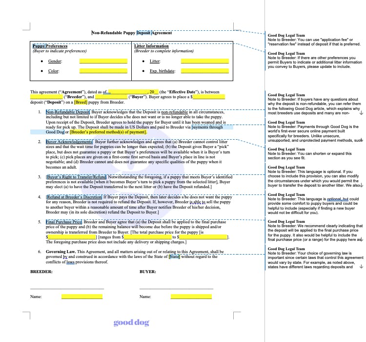 Access our sample Non-Refundable Puppy Deposit contract, available exclusively to Good Dog Breeders.