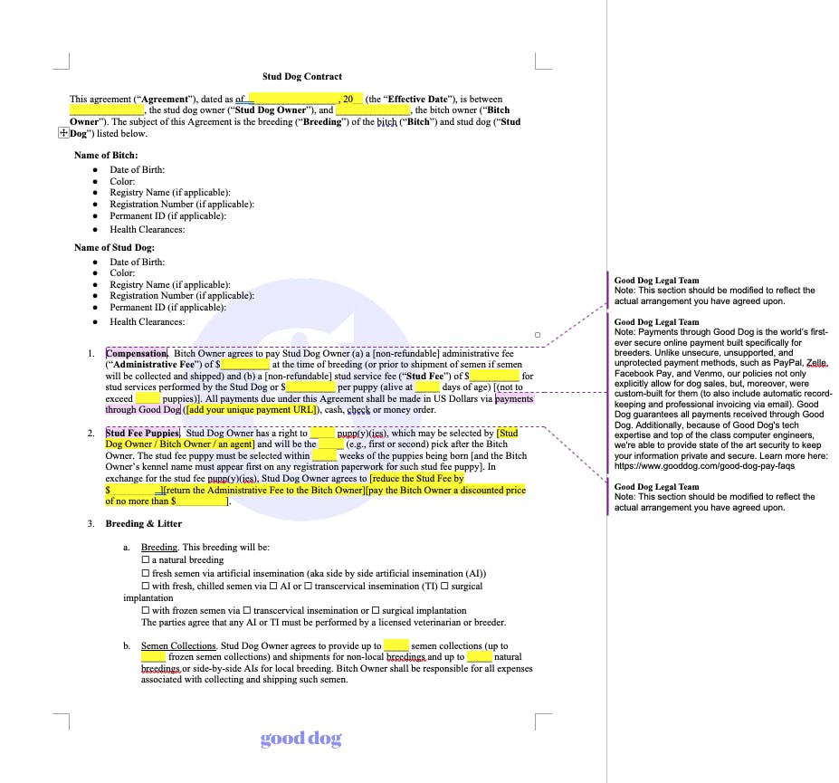 Access our sample Stud Dog contract, available exclusively to Good Dog Breeders.